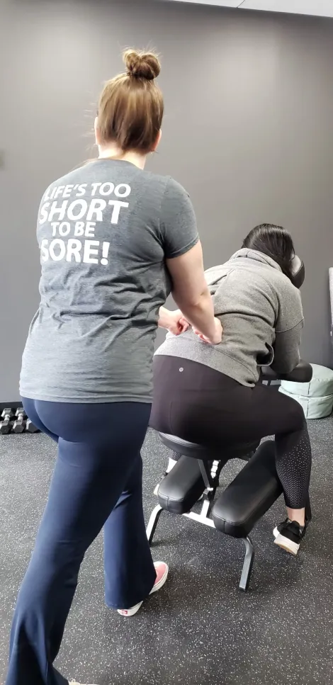 The modalities your massage therapist may choose to incorporate are; light to deep tissue techniques, kneading, squeezing, pulling of the muscles, acupressure, and more. Your therapist will focus on your shoulders, back, neck, arms, and head. You sit in a massage chair, which is ergonomically designed to provide optimal comfort. Typically, your face rests in the cradle built into the chair. This position allows your back and neck to fully relax, which allows your massage therapist to provide the best treatment possible.These techniques aim to relax your entire body and help you de-stress. They can also help prevent repetitive injuries, such as those caused by typing at a computer all day. Most chair massage sessions are shorter than standard treatments.